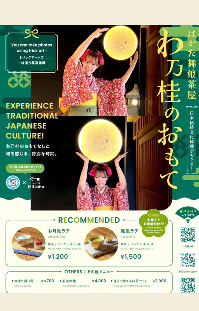 伝統芸能や伝統文化を継承していくため気軽に楽しめる場所を作りたいと、2023年、川端通商店街に「はかた芸処 わ乃桂」を開業。2026年店舗拡張とサービス改訂し、名称を「はかた舞娘茶屋 わ乃桂のおもて」へ変更しリニューアル。